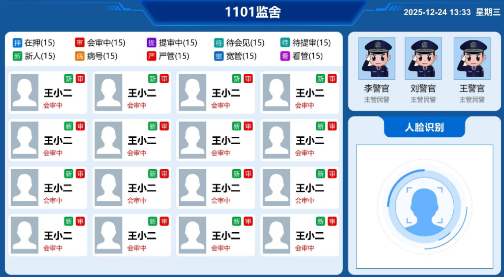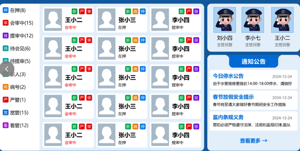 视诺智能交互系统基于流媒体核心技术研发,软件管理平台是以管教民警需求来设计(支持个性化定制)。主要功能包括信息查询、在线购物、人脸识别、周值班表、每日菜谱、账户余额(充值及消费记录)、SIP广播、视频对讲、在线课堂、三固表排班表等功能,其次!通过对接省局平台获取在押人员数据,管教或在押人员可以通过楼道21.5寸电子屏查询在押人员信息,查询信息方式有三种模式,首先是在押人员编号、其次是人脸识别、最后是指纹识别。在管理端,监所管教民警通过人脸识别进入指定页面,该页面是会显示该监区关押人员数量,包括显示在押案件信息、严管信息等字眼提醒,这有提升监所民警对在押人员的管理。